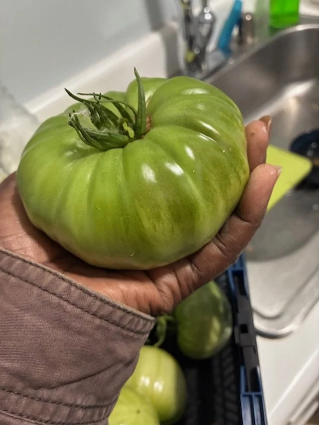 Latoya Brown-Zimmermann displays a tomato from her microfarm. Image provided by Latoya Brown-Zimmermann