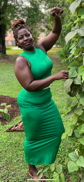 Latoya Brown-Zimmermann reaches for a plant while surrounded by greenery. Image provided by Latoya Brown-Zimmermann
