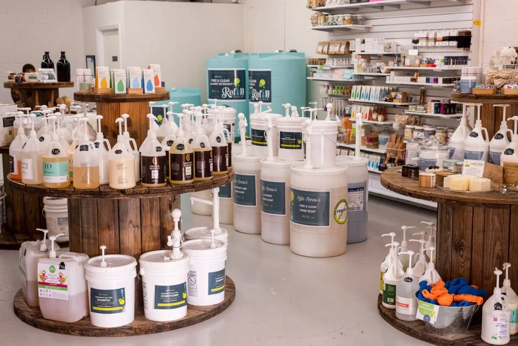 The interior of low waste store Refill & Renew where customers can find jugs, buckets and tanks of liquid products “on tap.” Image provided by Mandy Drumheller